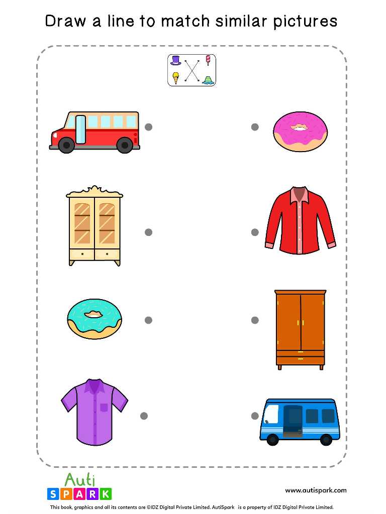 This matching pictures worksheet takes it a notch ahead. After same pictures, kids have to learn to match similar pictures. Here they will learn that the same picture can have many different versions and it will help them improve their matching skills. This is worksheet 10 in this series.